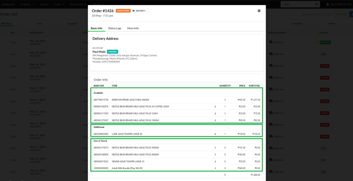 **(3)** The Customer’s Ordered Items and Information will be displayed