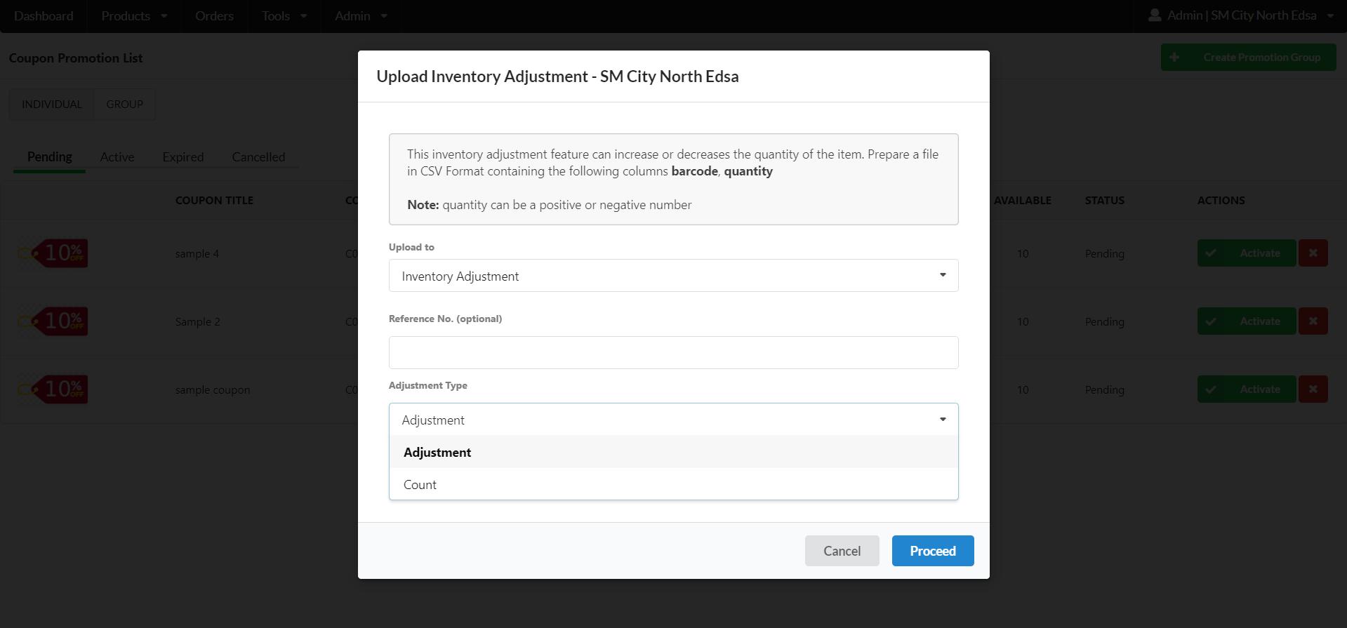 **(1)** On the Menu Bar, Go to Admin > Uploads > Upload Inventory